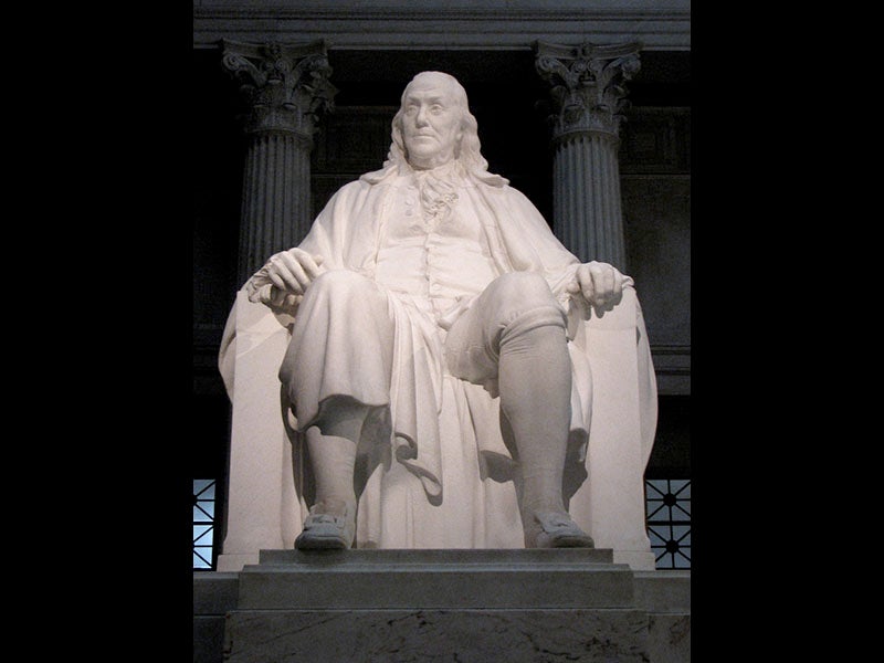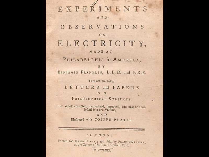 Benjamin West’s 1816 portrait of the electrical Franklin is oversaturated with artistic license, especially in its depiction of Franklin’s assistants, but it is still a charming painting (first image). There is a fine marble statue at the Franklin Institute in Philadelphia (third image). We have the 4th and most complete edition (1769) of Franklin’s Experiments and Observations in the History of Science Collection (second image).