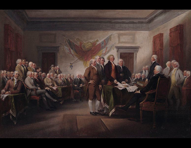 One of Silliman's most notable achievements had nothing to do with sciences, but was a milestone in the field of gift planning. In 1830, he visited the Connecticut artist John Trumbull, then living in New York City. Trumbull had been the major visual recorder of the American Revolutionary War. Four of his large paintings, including the Signing of the Declaration of Independence and the Surrender at Yorktown, were commissioned by the government and hung in the rotunda of the U.S. Capitol in Washington in 1825. But when Silliman visited in 1830, Trumbull was 75 years old and had no appreciable income. His apartment was filled with his paintings from the days of the Revolutionary War, including the original small versions of the Signing of the Declaration (first image) and the Battle of Bunker's Hil (fifth image), along with portraits of George Washington and Alexander Hamilton, and dozens of miniatures. Trumbull indicated that he would be happy to give his collection to Yale, if they would just give him an annual allowance that he could live on until he died.