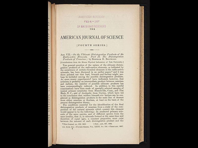 In 1907, Boltwood published a paper in the American Journal of Science that is a milestone in the history of radiometric dating (third image). He proposed that one could calculate the age of rocks by comparing the uranium and lead levels in those rocks. No one yet knew the half-life of uranium (at 4.5 billion years, it is difficult to measure), but they had a pretty good idea of the half-life of radium, and that is what Boltwood used in his calculations. He chose 20 different mineral samples, from all over the earth, whose lead and helium percentages he was able to measure, and for 10 of those he felt confident enough to calculate an age, which he provided in a table (fourth image). Most of the specimens yielded ages of 500 million years or so, which was many times larger than the commonly-accepted age of the Earth (100 million down to as low as 20 million years), and one of his specimens, a piece of thorianite from Sabaragamuwa Province in Ceylon (now Sri Lanka) yielded the staggering age of 2200 million (2.2 billion) years. When Boltwood’s proposed method of uranium/lead dating was confirmed by Arthur Holmes in 1911, the modern era of radiometric dating was off and running.