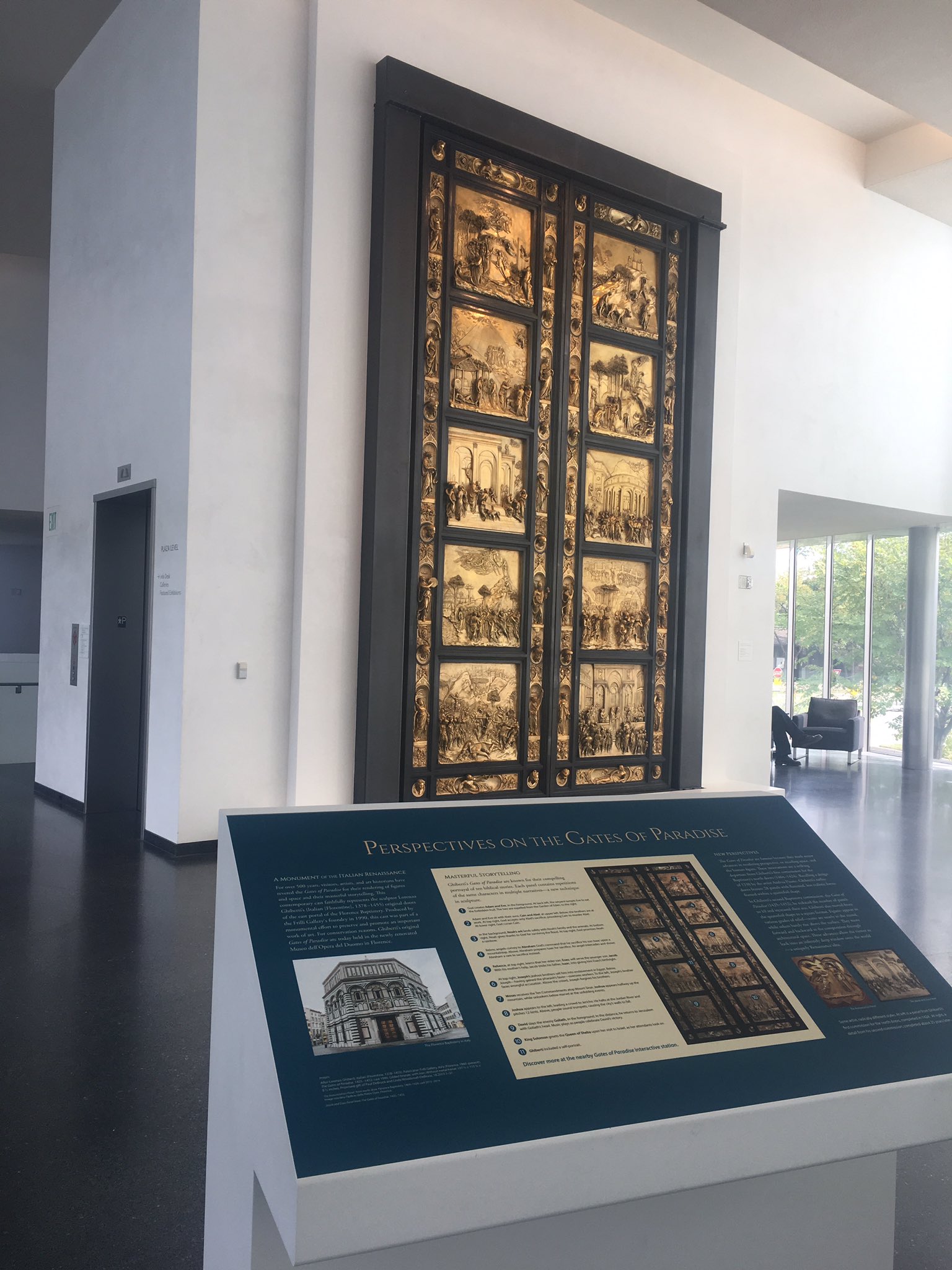 Much later, after the Florentine floods of 1966 had further damaged the Doors of Paradise, it was decided to make replacement doors. A donor was found for this multi- million-dollar project; Bearzi’s molds, which had been bought by another Florentine foundry, were hauled out of storage; and a replacement set of bronze doors was cast. In fact, two sets of doors were made. One set was hung on the Baptistery, with the originals going into the Duomo Museum. The second set, many years later, was acquired for the Nelson-Atkins Museum here in Kansas City, where they are on display, and which you can see here.