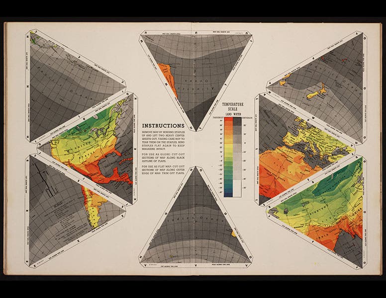 The original 1943 map was comprised of 6 squares and 8 equilateral triangles. We have two copies, one still intact in the Life issue, and one cut into pieces, retaining the tabs. We have assembled the cut-up version in two different layouts so you can see the versatility of Fuller's idea (third and fourth images). It would be nice if we could acquire two more copies--one that we could cut apart without the tabs, which would produce a more elegant map, and one that we can paste together into a globe. Actually, libraries don’t cut things up, so I will probably have to do that on my own.