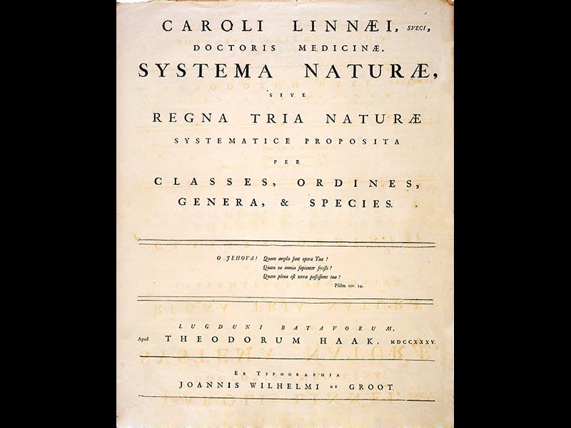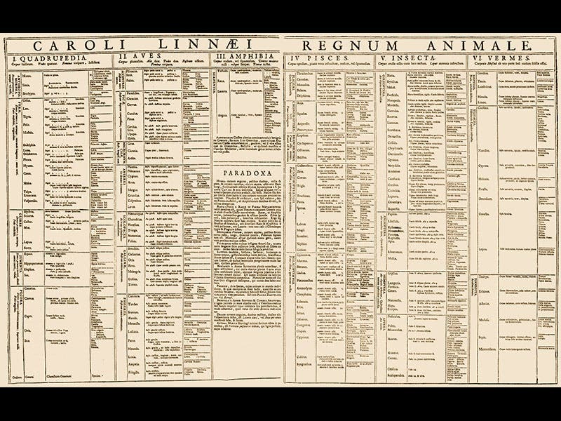 Carl von Linné, a Swedish botanist better known as Carl Linnaeus, died Jan. 10, 1778, at age 70. In 1735, Linnaeus published a tall, slim pamphlet of 14 pages called System naturae--The System of Nature (second image). Here, in tabular form, he divided up the three kingdoms of nature--animal, plant, and mineral--into classes, orders, genera, and species. The animal kingdom occupies just two facing pages (third image), but here, for the first time, humans take their place in the order of Anthropomorpha (soon to be renamed Primates), with the generic name Homo and the specific name sapiens. Similarly, dogs, raccoons, tigers, and ferrets find a home in the order of Ferae (to be renamed Carnivora) and squirrels, porcupines, and rabbits share the order Glires, or Rodents. Interestingly, in this first edition, Linnaeus has an entire section, seemingly an order in itself, that he calls Paradoxa. These contain all the animals that don't fit or are too poorly known, such as the phoenix, or mantichore, or the Rana piscatrix--the fishing frog. In later editions, Linnaeus sorts this all out, until by 1758, the 10th edition of the Systema has expanded to two fat volumes with descriptions of thousands of species. The first edition of 1735 is very scarce and we do not have it in our collection. But the Library does own the 10th edition, which is really the most important, since it is officially the starting point for all modern zoological and botanical nomenclature. We displayed our copy in the 2009 exhibition, The Grandeur of Life.