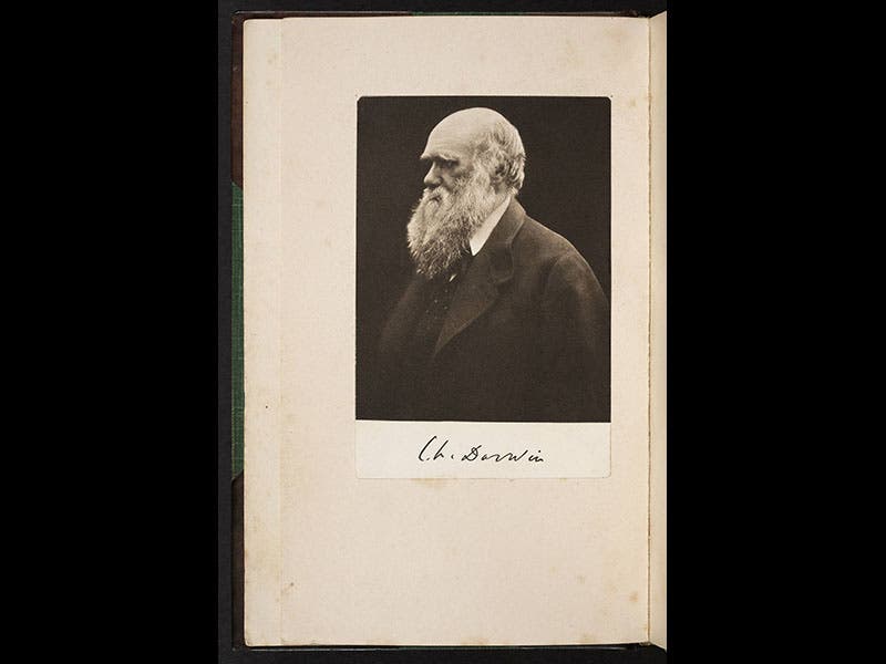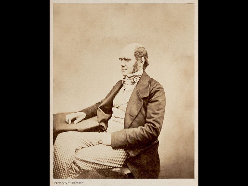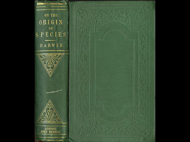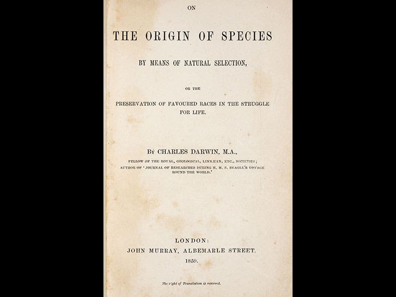 Charles Darwin’s On the Origin of Species was published on Nov. 24, 1859. Considering that his preliminary paper on evolution by natural selection of the year before had been generally ignored, Darwin was surprised, and delighted, to learn that all 1250 copies of the book had already been subscribed to by publication day. The book was plain and sturdy, without illustrations, and that suited Darwin just fine. He wrote the publisher, John Murray: “I am infinitely pleased & proud at the appearance of my child”. Darwin bought 80 copies himself, and had them sent out to colleagues and fellow scientists. These advance copies were sent out by Murray’s firm, so if your copy says “with the author’s compliments,” it is not in Darwin’s hand. Each recipient then received a hand-written letter from Darwin, tailored to suit each person’s makeup and probable reaction to Darwin’s ideas. The big surprise was that 500 copies were bought by Mudie’s Circulating Library, insuring that Darwin’s book would be read by several thousand more people than the initial printing would otherwise allow. However, to keep things in perspective, on the same day Mudie ordered 3000 copies of Leopold McClintock’s Narrative of the Discovery of the Fate of Sir John Franklin (also published by John Murray). We have one of the original 1250 copies of the Origin of Species in our History of Science Collection, and we displayed it in our 2009 exhibition, The Grandeur of Life, which commemorated the 150th anniversary of the book’s publication. The title page is also shown above (first image). Our copy has been rebound, so the original cloth version shown above (second image) is from another institution’s copy.