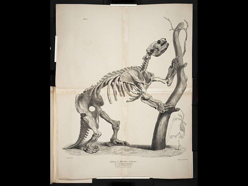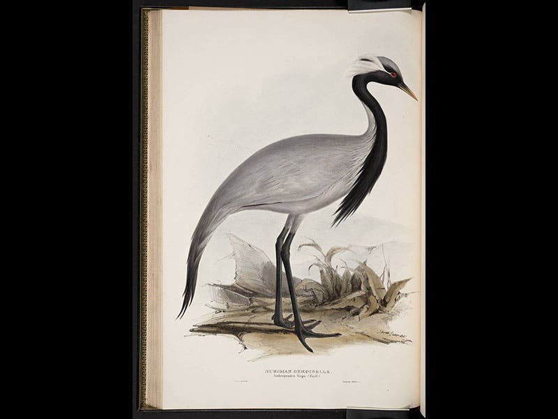 Charles Hullmandel, an English artist and printer, was born June 15, 1789. While making an artist's tour of Europe in 1817, he met Alois Senefelder, who had invented the lithographic printing process some 20 years earlier. Hullmandel was apparently inspired by this encounter, for he came home and set up the first lithographic press in London. Many of his prints were portraits--the National Portrait Gallery in London has over a hundred of them--but he also did many natural history illustrations for books and journals. The printer's name appears on most lithographic impressions, usually in the lower right-hand corner, but the printer is often ignored in favor of the names at the lower left, the original artist and/or the person who transferred the drawing to stone. Often the lithographic printer is not recorded in indexes or as metadata, and the only way to find out which prints were done by Hullmandel is to look at a whole slew of material printed in London in the 1820s through the 1850s. We have done just that, and we see above six assorted Hullmandel prints. They are, in order: a Numidian demoiselle, drawn by Edward Lear, from John Gould's Birds of Europe (1837); a section of Paviland Cave in Wales, from William Buckland's Reliquae Diluvianae (1823); an Australian numbat, from an article in the Transactions of the Zoological Society of London (1841), and a skeleton of a Mylodon, from Richard Owen’s Description of the Skeleton of an Extinct Gigantic Sloth (1842).