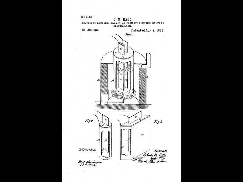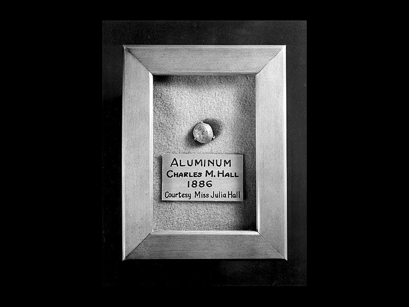 Charles Martin Hall (1863-1914), a young chemist, had just graduated from Oberlin College in 1884 when he decided to tackle the problem of producing aluminum metal from aluminum ore. Aluminum is the most abundant metal on earth, but it had only been isolated in 1827, and in the ensuing fifty years, no one had discovered an economical way to separate aluminum from its compounds. The small 6-pound aluminum cap that they placed atop the Washington Monument in 1884 would have been cheaper if they had used silver. In a woodshed in the family’s back yard, Hall finally worked out a way to use electrolysis on a special molten soup of aluminum and sodium fluorides, and he made his first hot liquid drops of pure aluminum on Feb. 23, 1886. He had patents within three years and, with financial backing, founded the Pittsburgh Reduction Company, which began producing affordable aluminum for the first time. His company eventually evolved into the Aluminum Company of America, or, as we now know it, Alcoa. Hall left much of his estate to Oberlin College, so he is persona magna grata around the school, and some years ago they dedicated a commemorative statue of Hall, made—appropriately—of aluminum. Unfortunately, aluminum statues are easy to ferry around, which college students like to do, and so Hall appeared all over campus, until eventually the authorities had to bolt the statue down, inside the school's science center, where it still sits.
