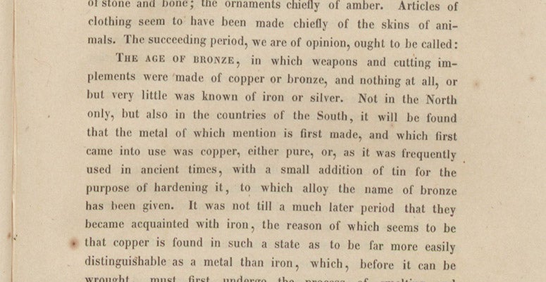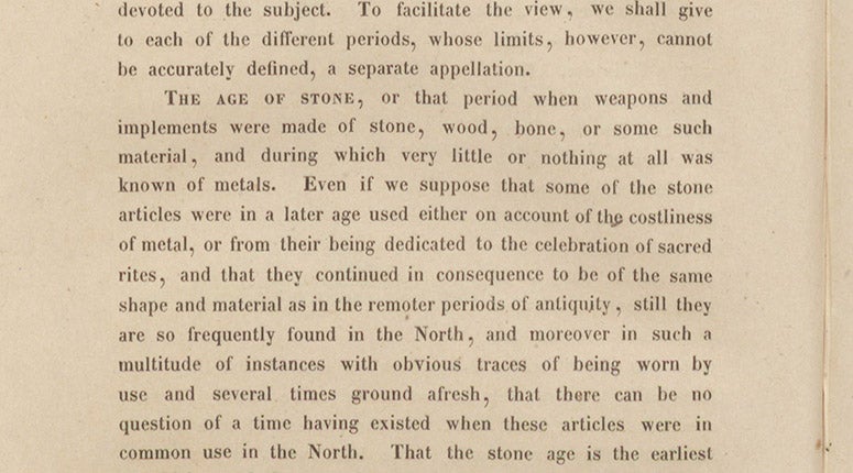 We could show you the first appearances of Stone Age, Bronze Age, and Iron Age in the Danish first edition, but since we write for an English-speaking audience, we show you instead the opening paragraphs of the sections on the three ages from the English edition of 1848 (see the three images just below). This edition is often listed in catalogs under the name of the compiler and translator, Frank Egerton, Earl of Ellesmere, but Thomsen’s 1836 pamphlet is here in its entirely, now in English form.