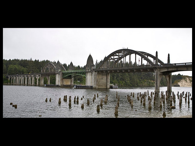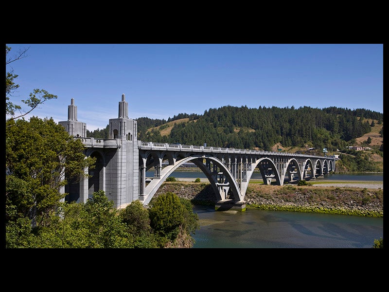 We saved everyone’s favorite McCullough bridge for last: The Yaquina Bay Bridge, which opened in 1936. What a beautiful structure (fifth and sixth images). This bridge is a through arch, with the central rainbow and the two adjacent arches made of steel, and the approach arches fashioned from concrete. In a photo of the approach arches from below (seventh image), one can see that McCullouch again combined Art Deco with Gothic. Note the detail even in the bridge’s underbelly, and the polished finish that was given to the concrete surfaces.