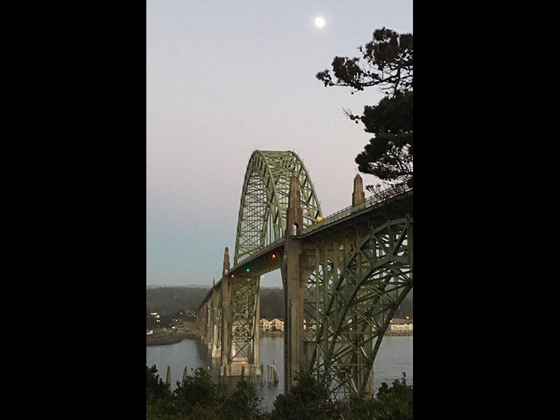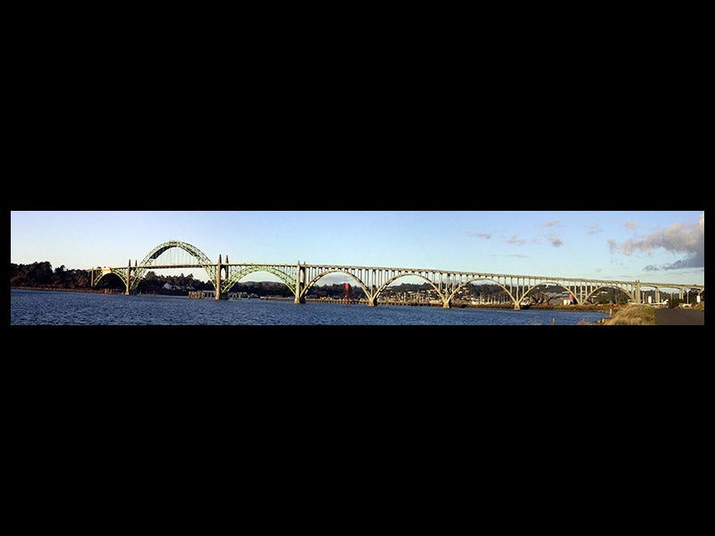 The formerly-named North Bend Bridge opened in 1936. This is a very long bridge, and very high as well, again because of the need to have open shipping lanes (fourth image). In this case the long central spans are a pair of cantilevers made of steel, while the arches on either side are concrete. This bridge does not have the aesthetic unity of the Isaac Patterson Bridge, but apparently it has done its job very well. After McCullough’s death, the name of the span was changed to the Conde B. McCullough Memorial Bridge.