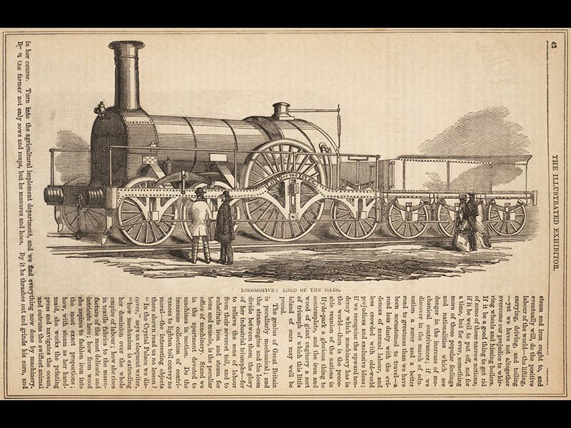 In order to keep his locomotives in service, Brunel needed an extensive repair facility, and Gooch suggested Swindon in Wiltshire as the site of a new maintenance plant. Swindon was right on the GWR line, about 35 miles from Bristol, and the Swindon Works was up and running by 1843. Although initially a maintenance facility, by 1846, Swindon was producing its own locomotives, most notably, the Iron Duke class of locomotives, designed by Gooch, with the first production model named The Great Western (fifth image). The Iron Dukes were 4-2-2's, with massive drive wheels, and they were capable of sustained speeds of 70 miles per hour, so they could make the London-Bristol run in just a few hours (plus stops). Thirty Iron Dukes were assembled at Swindon and put to work by 1855. One of them, the Lord of the Isles, was displayed at the Great Exhibition in 1851 before being put into service (first image). It is unfortunate that the broad gauge was eventually scrapped, because the Iron Dukes followed, and there do not seem to be any survivors on display anywhere, although there is a Firefly replica at the Didcot Railway Centre in Oxfordshire (sixth image).