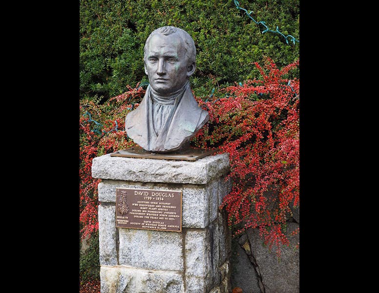 There are only three monuments to Douglas known to us. One is the David Douglas Pavilion at Scone Palace, which is constructed of wood from Douglas-firs grown on the estate, and has a marvelous fir-cone pendant inside (fourth image). The second is a bust of Douglas at the VanDusen Botanical Garden in Vancouver, British Columbia (first image). The Garden has chosen to honor only three botanists with sculptures wrought by Jack Harman; one is the obligatory Linnaeus, but the other two depict botanists who were important to the Pacific Northwest: Archibald Menzies and David Douglas.