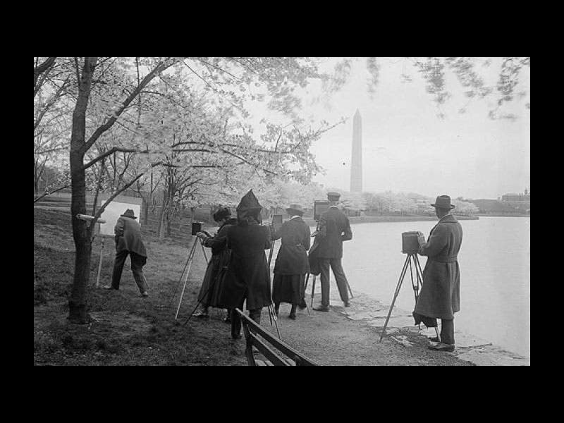 Perhaps Fairchild's most glamorous import was a stock of 1000 flowering cherry trees that he bought from a Japanese nursery in 1906 and planted on his own estate in Maryland (third image). Several people had been clamoring for the city of Washington to plant cherry trees on its open avenues to dress up the city, but no one paid any attention until Fairchild showed how beautiful cherry trees could be in the spring. He took an active role in promoting the flowering cherry tree as an ornamental, and in 1912, Washington finally planted its famous cherry trees, a gift from the Japanese Embassy (first image). Fairchild should have a statue somewhere among the capital's cherry trees, but I don't think he does. Perhaps that is why he moved to Florida in 1928 and lived out the rest of his days on a seaside estate adorned with hundreds of exotic plants that he had imported from around the world, and where he wrote three popular books about the pleasures of botanical travel, all of which we have in the Library. The first of these was The World Was My Garden; Travels of a Plant Explorer (1938) (fifth image), which is the source for the photo of his wife Marian among the cherry trees at their Chevy Chase estate (third image), and the photo of an older Fairchild (on the left) with some arums imported for the Arnold Arboretum (sixth image).