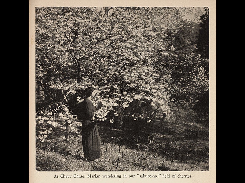 Perhaps Fairchild's most glamorous import was a stock of 1000 flowering cherry trees that he bought from a Japanese nursery in 1906 and planted on his own estate in Maryland (third image). Several people had been clamoring for the city of Washington to plant cherry trees on its open avenues to dress up the city, but no one paid any attention until Fairchild showed how beautiful cherry trees could be in the spring. He took an active role in promoting the flowering cherry tree as an ornamental, and in 1912, Washington finally planted its famous cherry trees, a gift from the Japanese Embassy (first image). Fairchild should have a statue somewhere among the capital's cherry trees, but I don't think he does. Perhaps that is why he moved to Florida in 1928 and lived out the rest of his days on a seaside estate adorned with hundreds of exotic plants that he had imported from around the world, and where he wrote three popular books about the pleasures of botanical travel, all of which we have in the Library. The first of these was The World Was My Garden; Travels of a Plant Explorer (1938) (fifth image), which is the source for the photo of his wife Marian among the cherry trees at their Chevy Chase estate (third image), and the photo of an older Fairchild (on the left) with some arums imported for the Arnold Arboretum (sixth image).