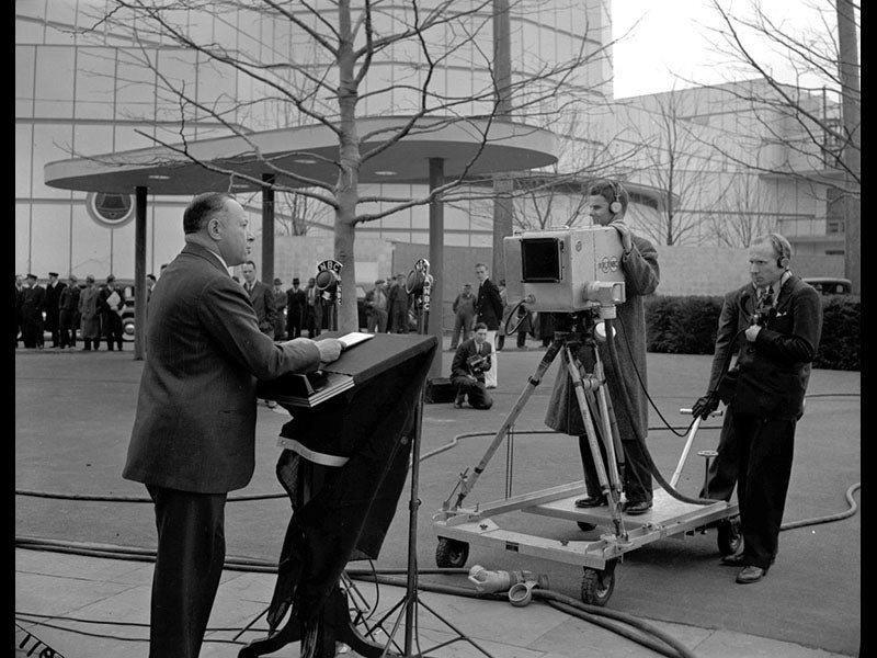 Under the General’s leadership, RCA grew into the country’s leading consumer electronics firm. Sarnoff oversaw the expansion of the National Broadcasting Company (NBC)—America’s first radio network. He subsequently spearheaded the commercialization of television, famously announcing the addition of “radio sight to sound” at the 1939 New York World’s Fair (fifth image) In 1942, Sarnoff also established a research center in Princeton, New Jersey, which became the birthplace of such prominent technologies as color television and the liquid crystal display (LCD).