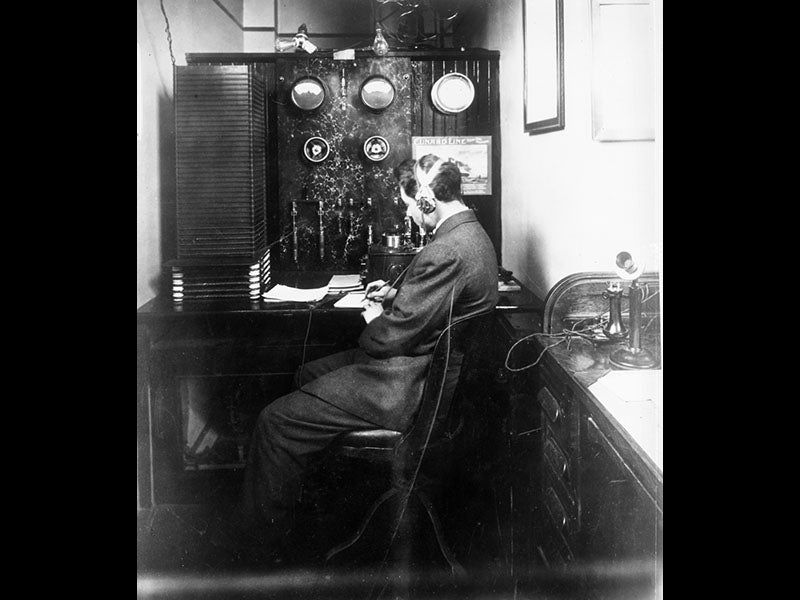 Although he lacked any formal technical education, Sarnoff proved a quick study. He taught himself Morse code in order to become a wireless operator and learned how to maintain transmitters at a Marconi station on Nantucket and on an Arctic seal hunting expedition. Soon after returning to New York, he assisted with rescue operations in the aftermath of the Titanic disaster. The following year, he was promoted to chief radio inspector for the entire Marconi operation (third image).