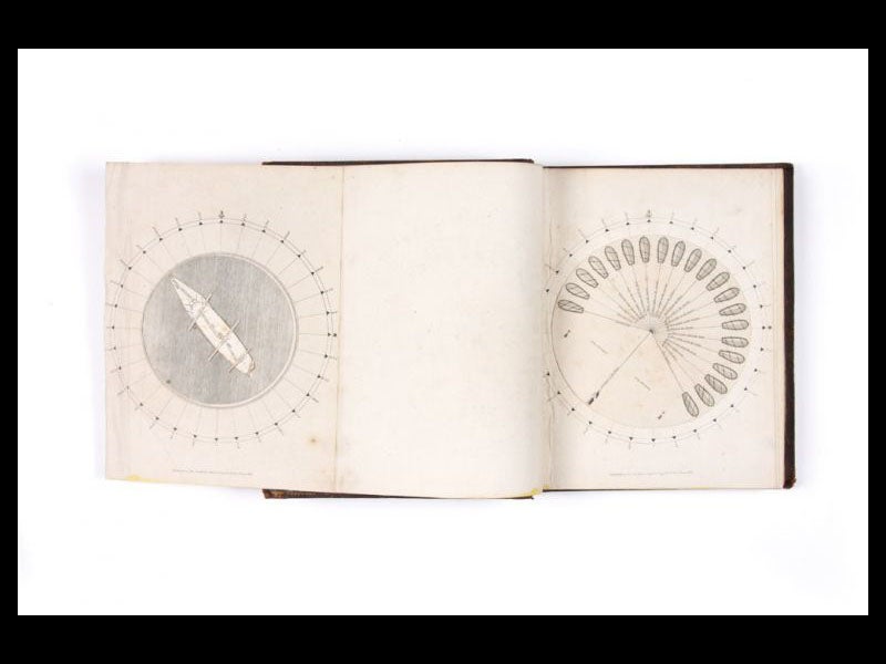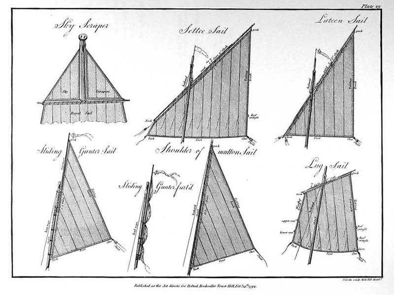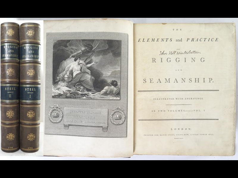 David Steel, an English bookseller, publisher, and author on maritime topics, died Jan. 19, 1803, at age 40. We know very little about Steel; what we do know comes solely from an obituary notice in The Gentleman's Magazine. But we do learn here that Steel collaborated with his father (about whom we know nothing) to publish The Elements and Practice of Rigging and Seamanship (1794). About the book we know a great deal. This is a large, handsome, two-volume work about ships, rigging, sails, and pulley blocks, illustrated with a copious number of very detailed engravings. Steel’s volumes are THE guide to ship-rigging in the Age of Nelson, and as such the set is highly sought after by maritime historians and model ship builders. It was often revised and reprinted, and several facsimiles have been published. Here in the Library we unexpectedly have a fine copy of the two-volume first edition. We have not digitized out copy, so the illustrations above come from online sources. We see a plate with 7 various ships with their rigging (first image); an offering from a rare book dealer's catalog, with a view of the spines of the two volumes, the frontispiece, and the title page (second image); a polacre (a bark) fully rigged (third image); a plate showing 6 types of sails (fourth image); and a curious folding plate containing a compass rose volvelle, with a moveable ship serving as pointer.