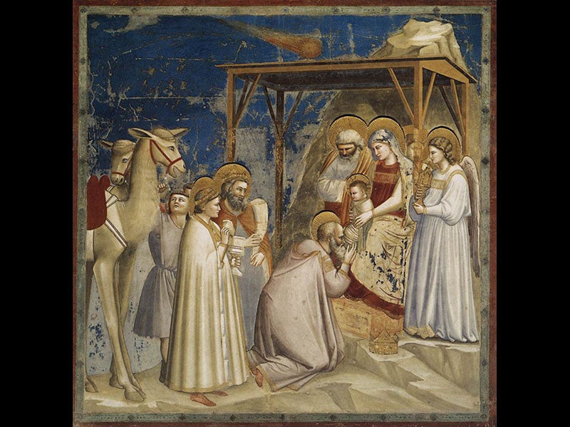 Comet Halley has returned three times since, in 1835, 1911, and 1986, and is next due back in 2061. There are not nearly as many pictorial records as there should be of past visits of Comet Halley; we see above a fairly undramatic photograph of the near approach of 1910 (third image). But two early appearances have spectacular visual records. Comet Halley appeared in 1066, when William the Conqueror was invading England, and the Bayeux tapestry has this appearance woven into its historical record (first image). And in 1305, painting a Visitation of the Magi for the Scrovegni Chapel in Padua, Giotto chose to substitute the comet for the Star of Bethlehem (fourth image).