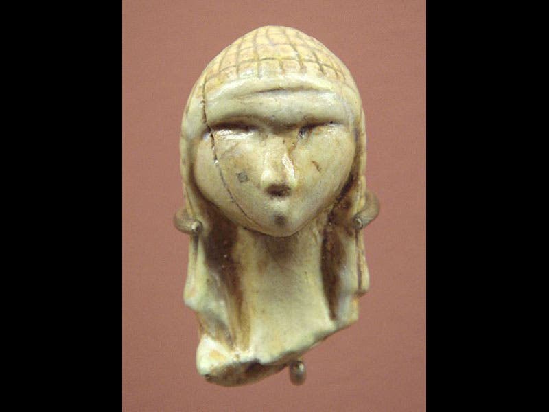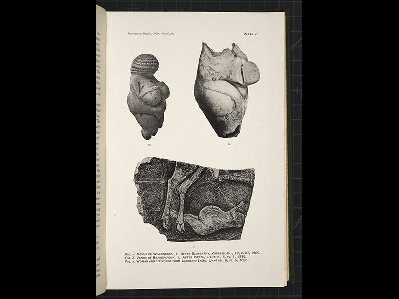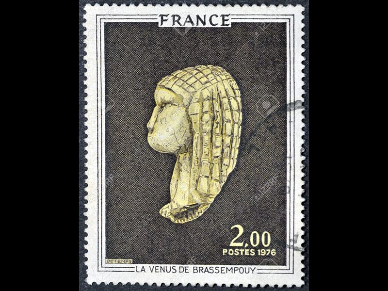 Edouard Piette, a French archaeologist, was born Mar. 11, 1827. In 1894, in the Grotte du Pape (Pope's Cave) in Brassempouy, in the southwestern corner of France, Piette found a small figurine carved out of mammoth ivory. It is only about one-and-a-half inches tall and depicts the face of a woman wearing a head covering (see first image above). At the time, this was only the third piece of Paleolithic sculpture depicting the human form ever found, and the first to show a face. Piette announced the discovery in 1895, in the journal l'Anthropologie (which is not in the Library’s holdings), and it quickly became known as the Dame à la Capuche (Lady with the Hood). It is often referred to as the Venus of Brassempouy (as Wikipedia does), but this is not correct, as Venus figurines are torsos, with no facial features, and there was another figurine found at Brassempouy, a partial torso with no head at all, that is the real Venus of Brassempouy (third image). But the Dame à la Capuche is a much more appealing figure, with her Mona Lisa hint of a smile, which is an even better trick in her case, since she has no real mouth. She was fashioned by a Cro-Magnon artificer about 25,000 years ago and now resides in the Musée d'Archaéologie Nationale at Saint-Germain-en-Laye, near Paris. In 1976, France issued a 2-franc stamp honoring la Dame (fourth image above).