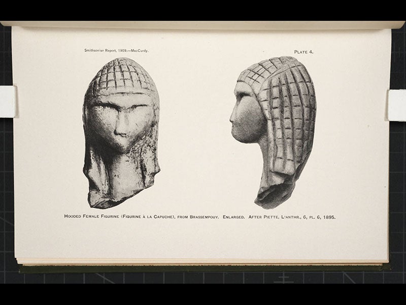 Edouard Piette, a French archaeologist, was born Mar. 11, 1827. In 1894, in the Grotte du Pape (Pope's Cave) in Brassempouy, in the southwestern corner of France, Piette found a small figurine carved out of mammoth ivory. It is only about one-and-a-half inches tall and depicts the face of a woman wearing a head covering (see first image above). At the time, this was only the third piece of Paleolithic sculpture depicting the human form ever found, and the first to show a face. Piette announced the discovery in 1895, in the journal l'Anthropologie (which is not in the Library’s holdings), and it quickly became known as the Dame à la Capuche (Lady with the Hood). It is often referred to as the Venus of Brassempouy (as Wikipedia does), but this is not correct, as Venus figurines are torsos, with no facial features, and there was another figurine found at Brassempouy, a partial torso with no head at all, that is the real Venus of Brassempouy (third image). But the Dame à la Capuche is a much more appealing figure, with her Mona Lisa hint of a smile, which is an even better trick in her case, since she has no real mouth. She was fashioned by a Cro-Magnon artificer about 25,000 years ago and now resides in the Musée d'Archaéologie Nationale at Saint-Germain-en-Laye, near Paris. In 1976, France issued a 2-franc stamp honoring la Dame (fourth image above).