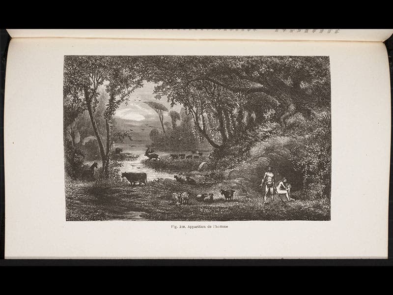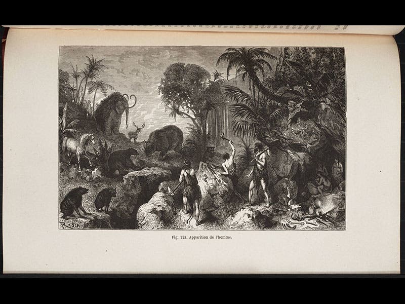 But one of Riou’s most interesting cuts for this book was “The Apparition of Man,” which was little more than a disguised “Adam and Eve” scene (fourth image). As the book went through subsequent editions, this scene changed. By 1866, Adam and Eve had been replaced by real prehistoric stone-weapon-wielding cave dwellers (fifth image), in as dramatic a transformation of views of human antiquity as one can find in this period. We have the first five French editions and the first English translation of Figuier’s World before the Deluge in our History of Science Collection, and we displayed the two “Apparition of Man” wood engravings by Riou in our 2012 exhibition, Blade and Bone: The Discovery of Human Antiquity.