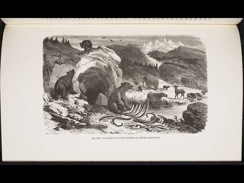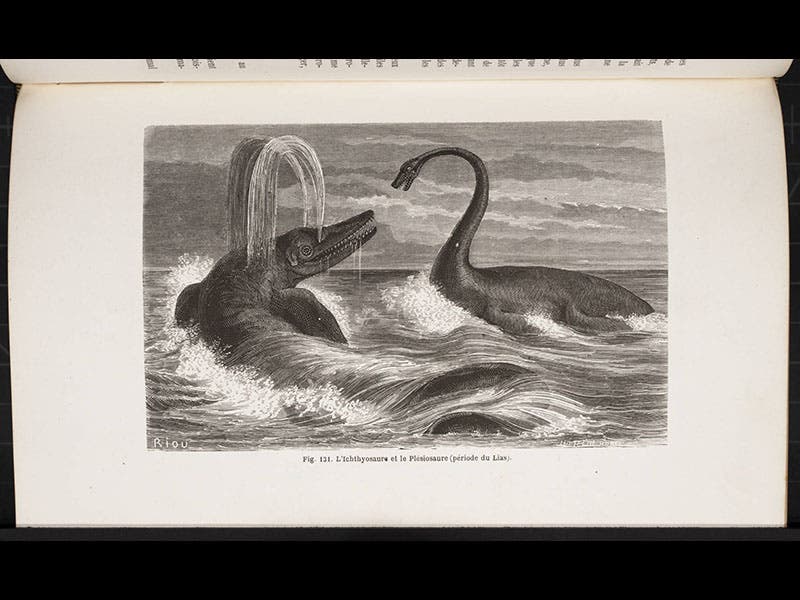 In the realm of scientific illustration, Riou was asked to provide the images for Louis Figuier's La Terre avant le deluge (The World before the Deluge), one of the first books devoted to prehistoric life, published in Paris in 1863. Riou designed a lush Carboniferous swamp, a Pleistocene ice age (see third image above), and two memorable Jurassic battlefields, with an Iguanodon and a Megalosaurus engaging each other tooth and claw (first image), and an Ichthyosaurus and a Plesiosaurus clashing on the high seas (second image).