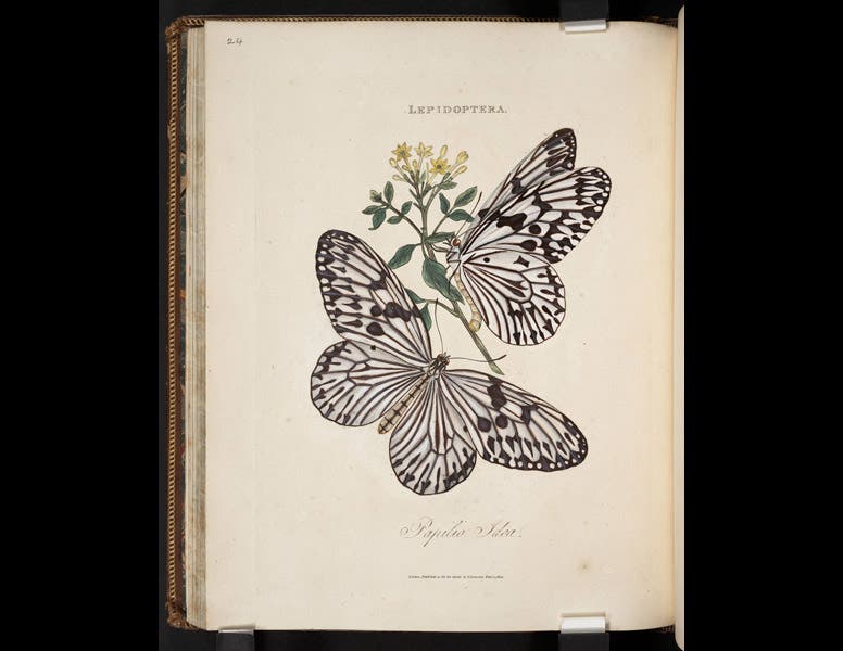 Edward Donovan, an Irish/English naturalist and illustrator, was born Feb. 1, 1768. Donovan was an odd sort of naturalist, in that he did not collect his own specimens in the field, but rather purchased them from commercial vendors and other collectors. He established a variety of museums in London in the early 19th century in which he mounted his specimens; he would then make illustrations from the mounts, engrave and color them, and then assemble them into books that he sold to make his living. He published a lot of these; we have four in our History of Science Collection, including The Natural History of British Shells (1799-1803), An Epitome of the Natural History of the Insects of China (1799), and An Epitome of the Natural History of the Insects of India (1800). The latter is a particularly impressive publication, in that the illustrations are so thickly colored that it is hard to tell that they are engravings; they look like original watercolors, and in some sense, they are.