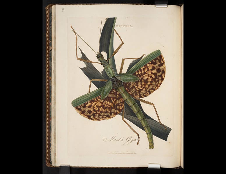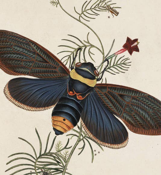 The first five images above are from the Insects of India and include, in order: a cicada; a milkweed butterfly with the odd name of Linnaeus’ idea; a Ulysses butterfly; a red-tipped firefly; and a giant mantis. Two more illustrations from this work are included in the online version of our 2009 exhibition, The Grandeur of Life. The last image above is a goose barnacle from Donovan’s British Shells.