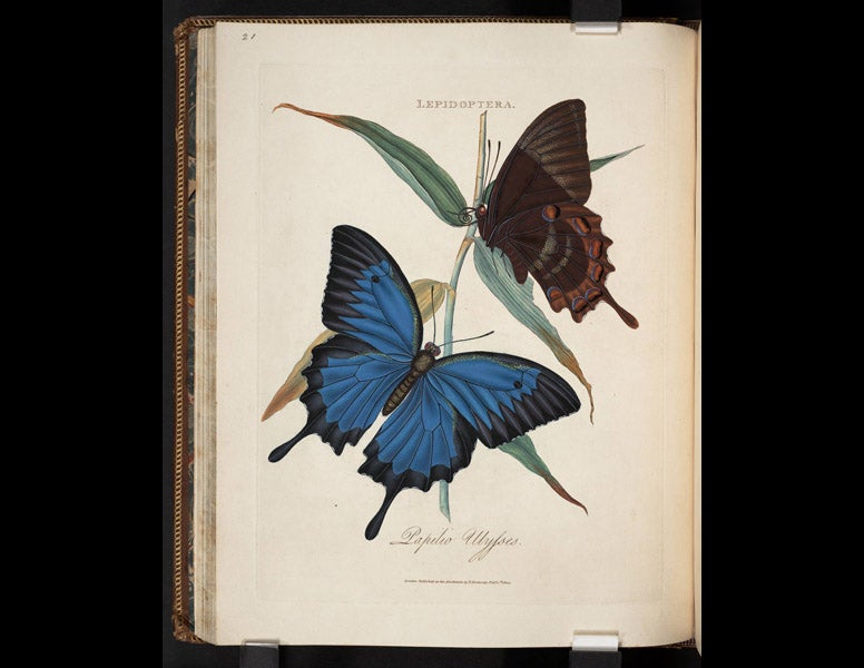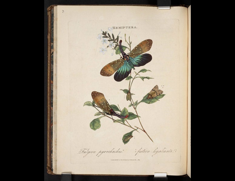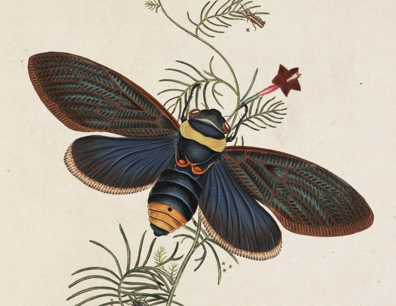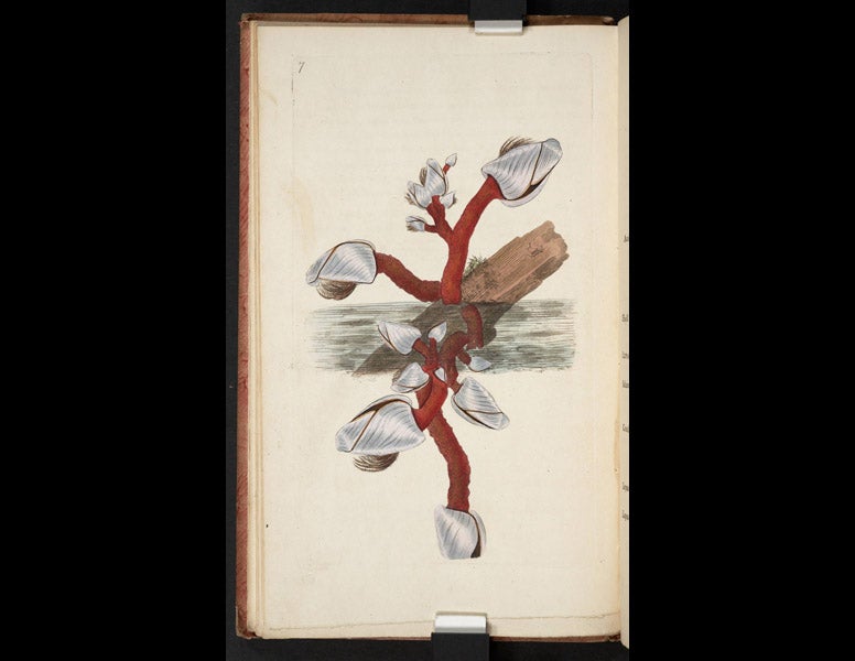 The first five images above are from the Insects of India and include, in order: a cicada; a milkweed butterfly with the odd name of Linnaeus’ idea; a Ulysses butterfly; a red-tipped firefly; and a giant mantis. Two more illustrations from this work are included in the online version of our 2009 exhibition, The Grandeur of Life. The last image above is a goose barnacle from Donovan’s British Shells.