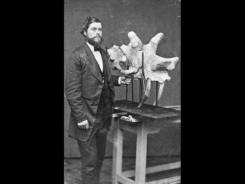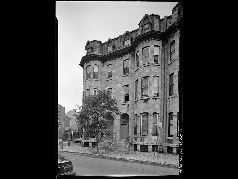 There are many surviving photographs of Cope. We show a carte de visite, in which Cope poses with the skull of Eobasileus (fourth image). The townhouses at 2100-02 Pine Street are a National Historic Landmark (fifth image).