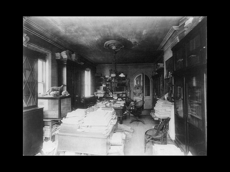 Cope published his discoveries as fast as he could find them--too fast, in the opinion of some, but otherwise it would have been hard to stay ahead of Marsh and his minions. Cope even bought his own journal, the American Naturalist, in 1878, so he had a ready vehicle for his publications. Cope owned two adjacent rowhouses on Pine Street in Philadelphia, living in one and storing his collections of thousands of fossils in the other. His study, in the second house, was something to behold (third image). The Academy of Natural Sciences thought they were going to get the collection, but Cope had been befriended by Henry Fairfield Osborn at the American Museum of Natural History in New York, and Cope sold most of his specimens to them, beginning in 1894. Cope died in 1897, at the age of 56.
