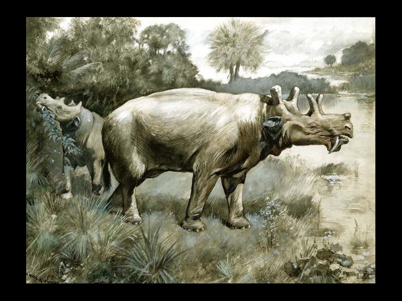 Edward Drinker Cope, an American paleontologist, was born July 28, 1840. Cope worked in Philadelphia, usually in cooperation with the Academy of Natural Sciences, and he was one of the first great vertebrate fossil collectors in the United States, as well as a life-long rival of the other great bone hunter of the period, Othniel Marsh, who taught at Yale. Most short accounts of Cope focus on the "Bone Wars" between Cope and Marsh, and they were pretty spectacular, or on Cope's dinosaur discoveries, but today we will look at another facet of his career, his discovery, description, and naming of extinct American mammals. We begin by showing a detail of Rudolph Zallinger's mural, the Age of Mammals (1967) in the Yale Peabody Museum of Natural History (first image). This section portrays a number of Eocene mammals: a six-horned Uintatherium in the right foreground, a short-legged carnivorous Mesonyx at bottom center, about to dine on an expired Hyracotherium (Eohippus), with a four-horned hippo-like animal, Eobasileus, in the near distance, and a gigantic terror bird, Diatryma, ruling the roost. Bear in mind that this mural is at the museum founded by Marsh and his uncle, George Peabody, where Cope's discoveries and names were decidedly unwelcome. It is startling then to realize that all but one of the animals mentioned and portrayed here were discovered and named by Cope between 1872 and 1875, the exception being the Uintatherium, which was discovered by Cope's mentor, Joseph Leidy. We see another reconstruction of Cope's Eobasileus in a painting by Charles Knight , who knew Cope well (second image).