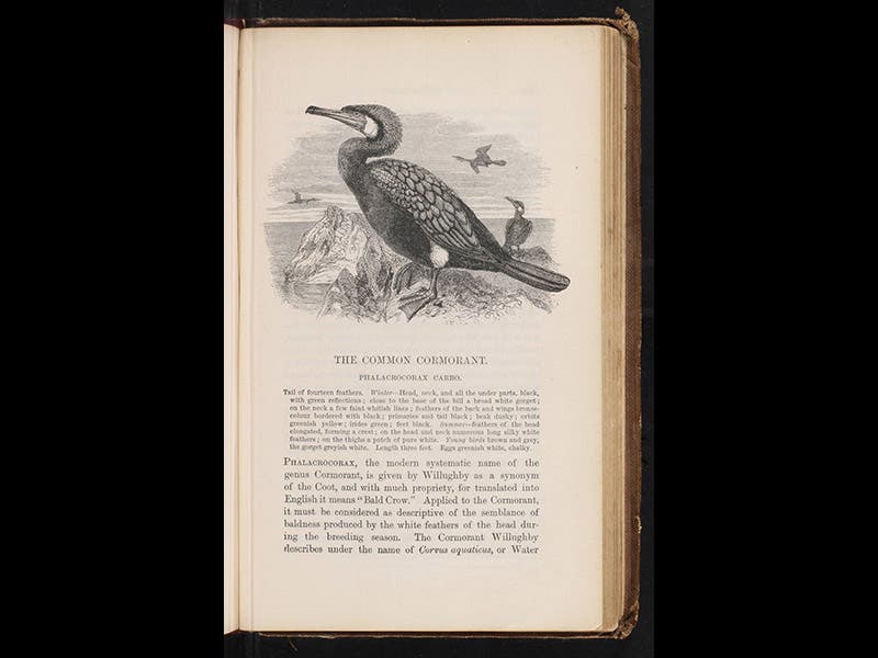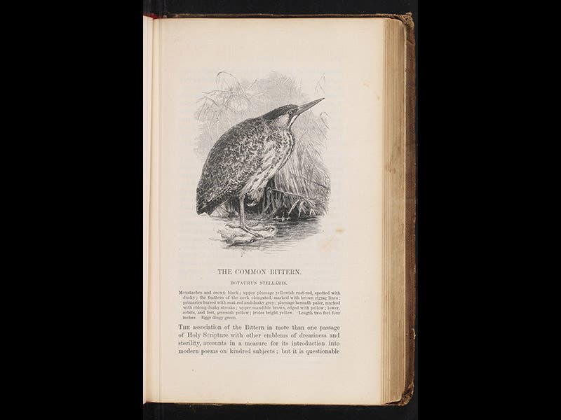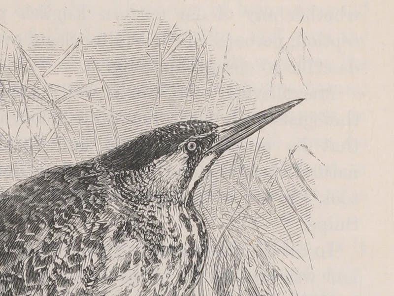 When he wasn’t climbing mountains or writing books about them, Whymper earned his keep by doing wood engravings for nature books. We have one book in the Library, Life and Habits of Wild Animals (1877), with engravings done by all four Whympers, but not too long ago, we acquired another, British Birds in their Haunts (1862), by Charles Johns, with the illustrations based on drawings by Joseph Wolf and engraved on wood by Edward alone. You can see some of Whymper’s handiwork above: a cormorant (third image) and the common bittern (fourth image). We also include a detail of the bittern, so you can appreciate how much detail can be packed into a wood engraving by someone as skilled as Whymper (fifth image).