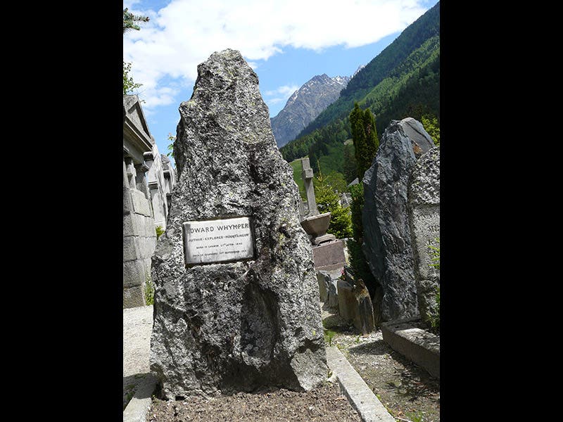 Whymper died at Chamonix, the French village below Mont Blanc, in 1911, when he was 71, and he was buried there, under a rough-hewn gravestone that suits him well (sixth image).