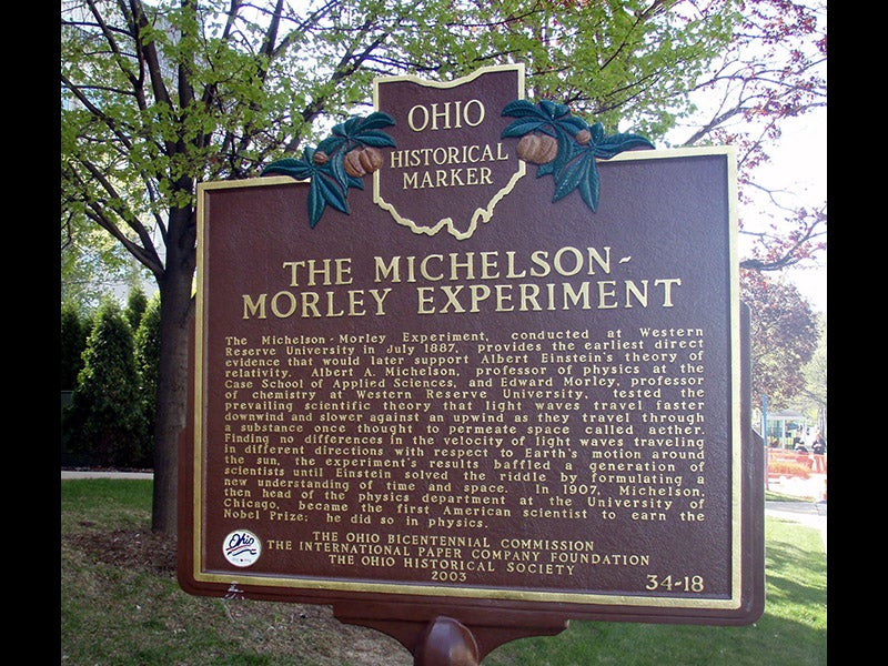 Morley was the detail man of the two, a stickler for accuracy and precision, and so he was probably the more surprised when the experiment failed to produce any detectable results. This meant either that the Earth is at rest in the ether (absurd to nearly everyone) or that there is no ether (equally absurd for a completely different set of reasons) or that objects contract in the direction of motion (the most absurd notion of all, and naturally, the one that turned out to be true, as Einstein would argue almost 20 years later). Michelson and Morley have ever since been combined into a single split-personality, Michelson-Morley. It is fitting then that their two schools, Case Institute and Western Reserve, should have merged in 1967 to form a new school, Case Western Reserve. Case Western can now list Michelson-Morley as one of their most famous alumni. “He” is commemorated with a historical plaque on campus (fourth image).
