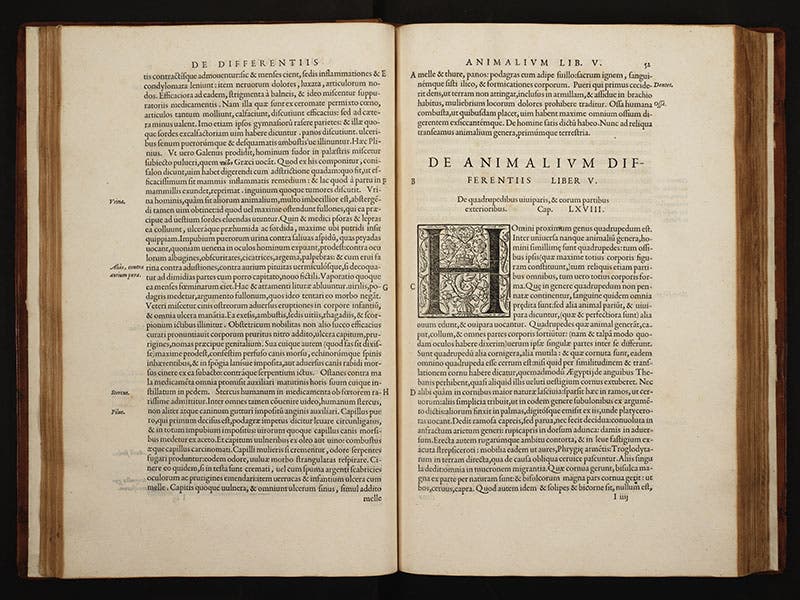 Once you get over the fact that Wotton’s book lacks woodcuts, and you look at it without any expectations, you realize that, even without pictures, this is a very handsome publication—well printed and nicely laid out, with handsome type fonts, especially the Italic. The printer was Michael Vascosanus, and we have three more of his imprints in our History of Science Collection—by Julius Caesar Scaliger, Oronce Fine, and Jean Pierre de Mesmes—each of them just as handsome as the Wotton. In fact, the owner of our copy of Wotton appears to have owned the Scaliger as well, for our copy contains a number of annotations referencing Scaliger’s book (fourth image).