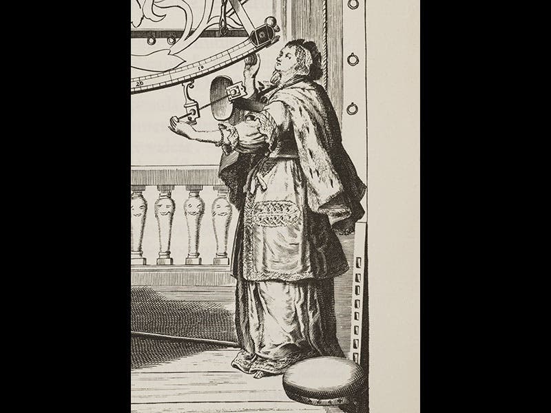 Elisabeth had to run a complicated household and raise a family, but she also entered into an observing partnership with her husband. Johannes in the 1660s was compiling a new catalog of the stars, and Elisabeth appears to have demonstrated competence with the large sextants and quadrants that Hevelius used for his observing program. When Hevelius published a book about the instruments of his observatory, the Machina coelestis (1673), he included two large engravings that showed Johannes at one side of an octant (second image) and a sextant (third image), and Elisabeth at the other. The first image, showing just Elisabeth, is a detail of the second. These are the first illustrations ever printed of a woman astronomer at work. We do not own a copy of the Machina–it is very scarce, since most copies burned up in an observatory fire in 1679–but we have a fine facsimile, from which the images above were scanned.