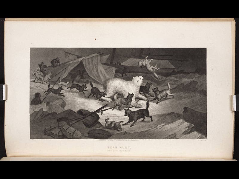 On the second Grinnell voyage, Kane was the commander of the Advance. The second voyage (1853-55) was by far the more harrowing, as the ship was frozen in along the coast of upper Greenland and never was freed. Kane and his men eventually had to hike out, and Kane almost died from scurvy on the trek south. However, he lived long enough to write a second narrative, Arctic Explorations, in two volumes (fifth image), this one a best seller, containing illustrations that were just as dramatic as those of the first (third and fourth images). We have both narratives in our collections, and we exhibited the two of them in our 2008 exhibition, Ice: a Victorian Romance, as item 38 and item 48. The dramatic engraving of the Advance silhouetted against the moonlight (third image) was used for the exhibition poster.