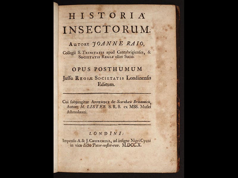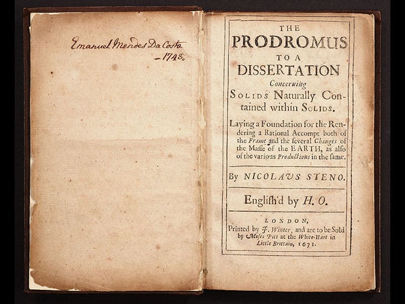 We do not have Mendes da Costa's Natural History of Fossils in the Library, but we have several interesting association items--books that Mendes da Costa had in his library and was probably forced to sell. The first is a very scarce book, Henry Oldenburg's translation of Nicolaus Steno's pioneering work of stratigraphy, Prodromus (1671). We display the title page and the facing blank, where Mendes da Costa signed his name and noted that he acquired the book in 1748 (first image). The other work is John Ray's Historia insectorum (1710; second image), which Mendes da Costa also signed and indicated that he had acquired the book from the library of Martin Folkes, who died in 1756 (third image). Folkes was the president of the Royal Society at the time of his death and was instrumental in securing Mendes da Costa's membership in that organization. Fortunately, Folkes did not live to see his protégé go down the long road to poverty and disgrace.
