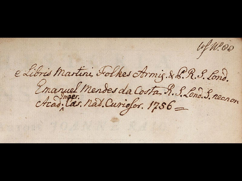 We do not have Mendes da Costa's Natural History of Fossils in the Library, but we have several interesting association items--books that Mendes da Costa had in his library and was probably forced to sell. The first is a very scarce book, Henry Oldenburg's translation of Nicolaus Steno's pioneering work of stratigraphy, Prodromus (1671). We display the title page and the facing blank, where Mendes da Costa signed his name and noted that he acquired the book in 1748 (first image). The other work is John Ray's Historia insectorum (1710; second image), which Mendes da Costa also signed and indicated that he had acquired the book from the library of Martin Folkes, who died in 1756 (third image). Folkes was the president of the Royal Society at the time of his death and was instrumental in securing Mendes da Costa's membership in that organization. Fortunately, Folkes did not live to see his protégé go down the long road to poverty and disgrace.