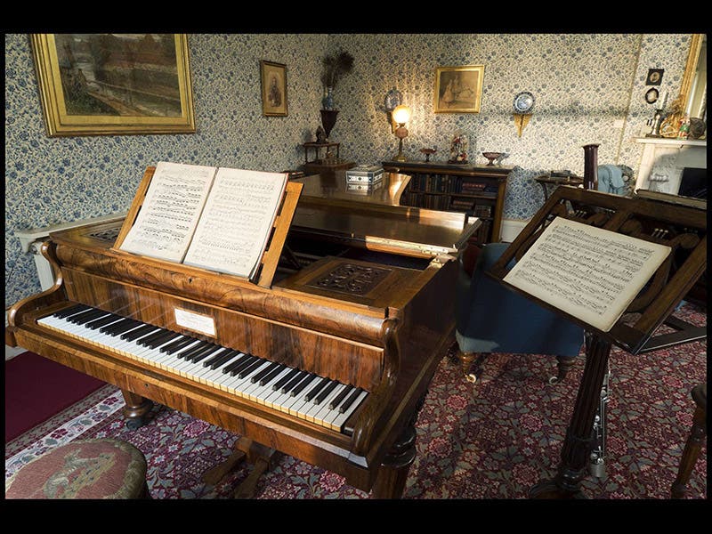 By all accounts, they were a happily married couple. Emma did not contribute to Charles' scientific work, but she raised a family of seven (three other children died young), and took care of Charles when he began suffering from an undiagnosed illness shortly after moving to Down House, an illness that lasted Charles's entire life. Emma would read to Charles regularly, and engage in a daily game of backgammon, and play the piano, which Charles found quite soothing. Emma was reasonably adept as a pianist--it is said that she took several lessons from Frédéric Chopin when she visited Paris as a young woman--and the Darwins owned a handsome Broadwood grand that is still preserved and on display at Down House (fourth image).
