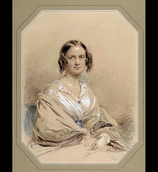 Emma Darwin, wife of Charles Darwin, was born May 2, 1808, about 9 months before her future husband. She was the grand-daughter of Josiah Wedgwood, founder of the Wedgwood Pottery firm. The Wedgwoods lived in Staffordshire, in an estate house known as Maer Hall, not that far from Shrewsbury, Shropshire, where the Darwin clan grew up. Darwin's mother was a Wedgwood, the sister of Josiah Wedgwood II, Emma's father, making Emma and Charles first cousins. They knew each other from childhood, and when Charles, two years back from the Beagle voyage, decided to marry in 1838, it was Emma he chose, and there appears to have been no reluctance on Emma's part. They were married on Jan. 29, 1839, in St. Peter's Church in Maer (second image), spent their first several years in London, and then moved to Down House in Kent (third image), where they would share their lives for forty more years, until Charles' death in 1882. Emma’s wedding portrait is shown above (first image).