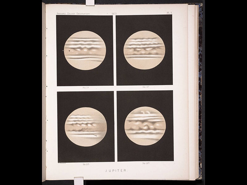 Etienne Trouvelot, a French painter turned American astronomical artist, was born Dec. 26, 1827. Trouvelot came to the U.S. in 1850 and moved to Boston, where he was employed as a nature artist by Louis Agassiz at Harvard. In 1870, Trouvelot bought a small telescope and started drawing astronomical objects. His artwork came to the attention of the director of Harvard College Observatory, and Trouvelot was given access to the 15" refractor that Harvard had acquired from Germany. In 1876, a collection of Trouvelot's lithographs were published in the Annals of the Observatory. We reproduce six of those lithographs above, depicting, in order: solar prominences, four views of Jupiter, the Sun, Saturn, four views of Mars, and the Andromeda nebula.