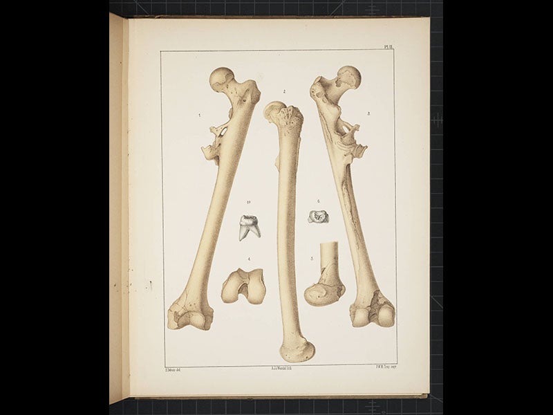 In 1891, at a site named Trinil in central Java, Dubois found a human tooth, a human-like femur, and a human-like skullcap. The femur was smaller than, but otherwise not that different from, a modern human's, but the skullcap was flat and shallow, with a much smaller cranial capacity than a modern human skull. Dubois called it "Pithecanthropus", after the name proposed by Haeckel for his hypothetical ancestor, and added the specific name "erectus." Being quite a mouthful, Pithecanthropus erectus quickly became "Java man" in the popular press. We now recognize Java man as the first discovered specimen of Homo erectus. Current thinking is that Homo erectus, although a very successful and wide-spread species, was not ancestral to Homo sapiens. We have Dubois’s book of 1894, Pithecanthropus Erectus, in the History of Science Collection, and we displayed it in our 2012 exhibition, Blade and Bone: The Discovery of Human Antiquity, along with a plate from a Smithsonian Institution Report of 1898 that announced the discovery to a U.S. audience.