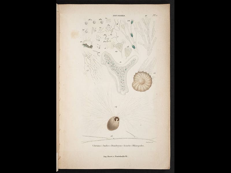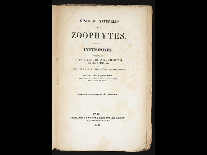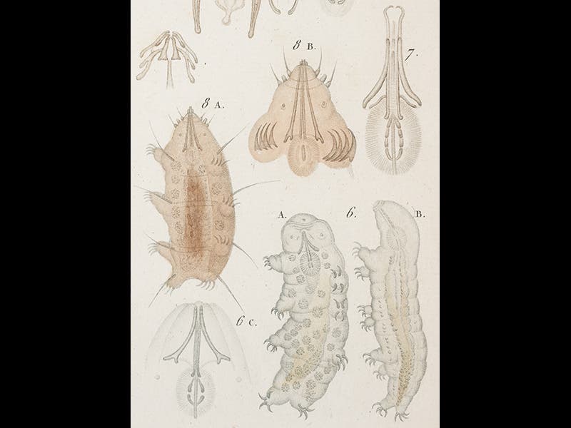 Felix Dujardin, a French invertebrate zoologist and microscopist, was born Apr. 5, 1801. Dujardin worked during what one might call the "golden age of infusoria," 1838-1850, when a number of observers turned their microscopes to what we now call Protozoa--those varied and tiny creatures like Volvox and Vorticella. The first book on the subject was Georg Ehrenberg’s Die Infusionsthierchen (1838), and Dujardin followed with his treatise, Historie naturelle des zoophytes, in 1841. Zoophyte was another 19th-century term--literally "animal plant"--for these microscopic forms of life. We exhibited Ehrenberg's book in our Grandeur of Life exhibition in 2009, and we planned to display Dujardin as well, but we ran out of room. However, we shot a number of images of what Dujardin called “Rhizopoda”, yet another early term for Protozoa; these images are available online, and we show three of his plates above. I direct you to one (third image) that depicts, among other things, the tiny tardigrade, or "water bear". There are three figures on the plate, at bottom center and bottom right, of this 8-footed little wiggle-worm, and we also show a detail of this part of the plate (fourth image). Water bears were discovered back in 1773, but Dujardin has the first good images of these little beasties. A number of years ago, NPR’s Science Friday did a piece on tardigrade research at the University of North Carolina, and the UNC website still has the NPR segment (and several short videos) of water bears in action. Click on the arrows to start the bears moving. The tardigrade shown in the videos is named Hypsibius dujardini, in honor of our Scientist of the Day.