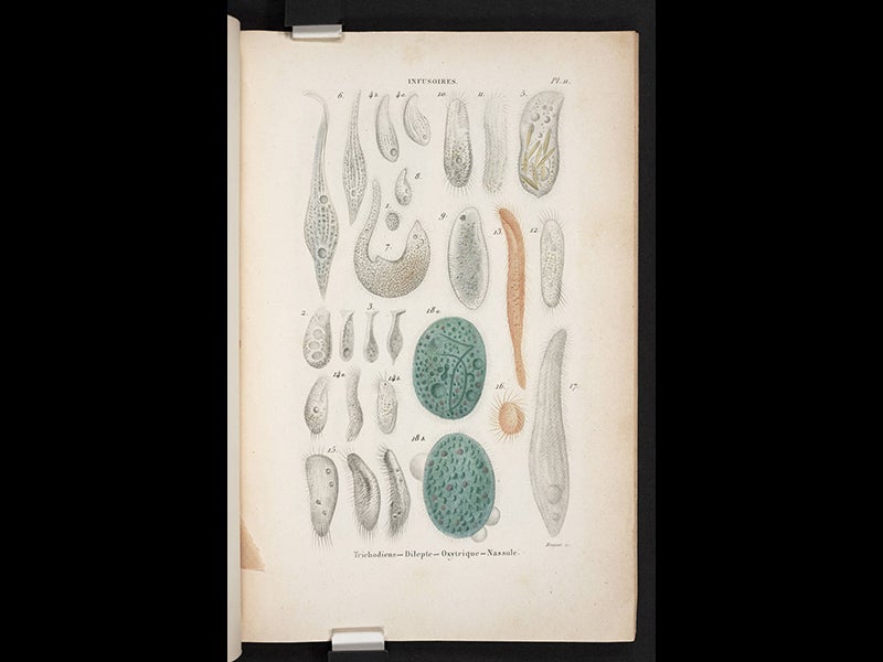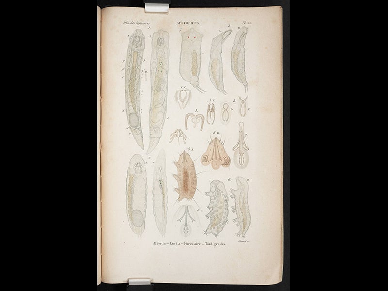 Felix Dujardin, a French invertebrate zoologist and microscopist, was born Apr. 5, 1801. Dujardin worked during what one might call the "golden age of infusoria," 1838-1850, when a number of observers turned their microscopes to what we now call Protozoa--those varied and tiny creatures like Volvox and Vorticella. The first book on the subject was Georg Ehrenberg’s Die Infusionsthierchen (1838), and Dujardin followed with his treatise, Historie naturelle des zoophytes, in 1841. Zoophyte was another 19th-century term--literally "animal plant"--for these microscopic forms of life. We exhibited Ehrenberg's book in our Grandeur of Life exhibition in 2009, and we planned to display Dujardin as well, but we ran out of room. However, we shot a number of images of what Dujardin called “Rhizopoda”, yet another early term for Protozoa; these images are available online, and we show three of his plates above. I direct you to one (third image) that depicts, among other things, the tiny tardigrade, or "water bear". There are three figures on the plate, at bottom center and bottom right, of this 8-footed little wiggle-worm, and we also show a detail of this part of the plate (fourth image). Water bears were discovered back in 1773, but Dujardin has the first good images of these little beasties. A number of years ago, NPR’s Science Friday did a piece on tardigrade research at the University of North Carolina, and the UNC website still has the NPR segment (and several short videos) of water bears in action. Click on the arrows to start the bears moving. The tardigrade shown in the videos is named Hypsibius dujardini, in honor of our Scientist of the Day.