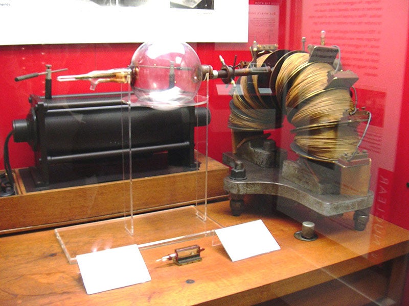 Francis William Aston, an English chemist turned physicist, was born Sep. 1, 1877. Aston was at the Cavendish Lab in Cambridge in 1913 when his boss, J. J. Thomson, discovered that the element neon seemed to have two different atomic weights, one about 20 times as heavy as hydrogen, and the other about 22 times heavier. These came to be called isotopes, and it was suspected that other elements had different isotopes as well, but there was no easy way to separate them and determine their atomic weights. In 1919, Aston invented the mass spectrograph (second image). This instrument takes ions boiled off a cathode and sends them through a magnetic field, which bends the ion stream into a loop. If several isotopes are present, then the heavier isotope will be curved less, and the ion stream will be divided into two (or more) parts, which will then produce two (or more) spots on a photographic plate, revealing the existence and, if done precisely, the atomic weights of the isotopes.
