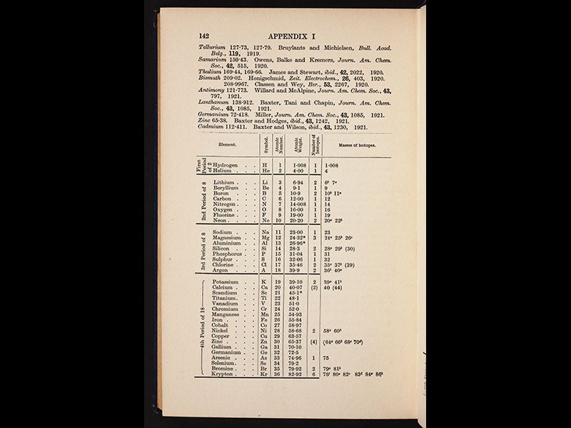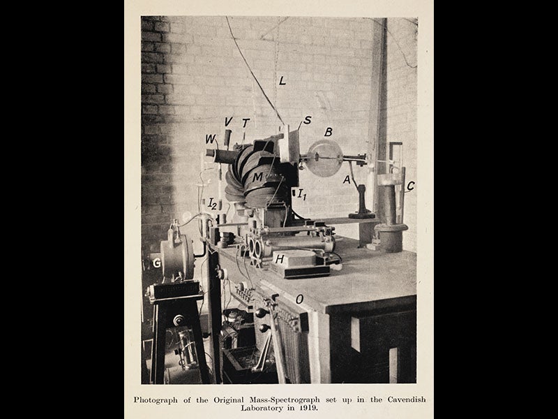 Aston's discoveries were so dramatic, and so significant, that he was awarded the Nobel Prize in Chemistry in 1922, the very year his book Isotopes was published. The second image above is from our copy of this book, as is the third, which shows the first part of a table of the elements. The right-most column presents the new isotopes, every one of them discovered by Aston. The other images depict: Aston at work in his lab with a later version of his mass spectrograph (first image); J.J. Thomson, Ernest Rutherford, and Aston (fourth image); a modern photo of the Old Cavendish Lab, where Aston worked (fifth image); and the original mass spectrograph of 1919, currently on display in the Science Museum, London (sixth image).