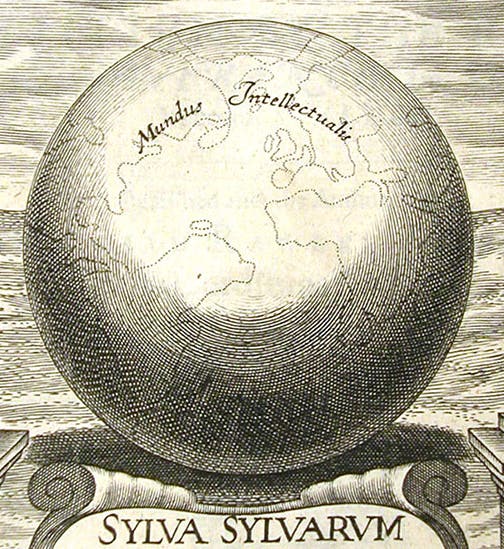 At the very end of that first post, we introduced a second conceit, the “intelligible world,” which Bacon invented to complement the pillars of Hercules, and I thought we might pursue this further today. The intelligible world first appeared in the Novum organum (where it is sometimes called the intelligible globe), but it only acquired visual form on the engraved title page of his Sylva sylvarum, a posthumous publication of 1626 (we have the second printing of 1628). We showed this engraving in our original post, but since it is a focal point today, we reproduce it again here (third image). The idea is that there are two worlds to explore out there, the material world, and the world of the mind. The material globe has been an object of interest since Columbus, but the intelligible globe has not. The pillars of Hercules for the intelligible globe (Aristotle and other ancient natural philosophers) have hardly been breached, and we need to change that, if we are to going to discover new realms with our mind.