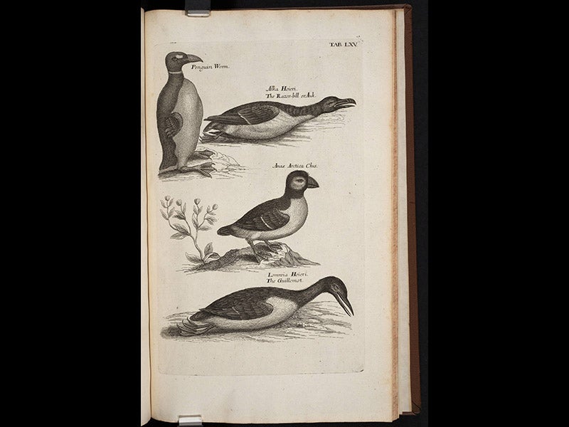 For the illustrations in the bird volume, Ray used whatever he could find or were supplied by correspondents; the hoopoe is quite handsome (first and fourth image), as is the standing loon (second image); the horizontal loon was taken from Ole Worm’s museum book, and the dead razor-billed auk and guillemot (third image) were supplied by Thomas Browne, who refused to pretend the birds being drawn were still alive.