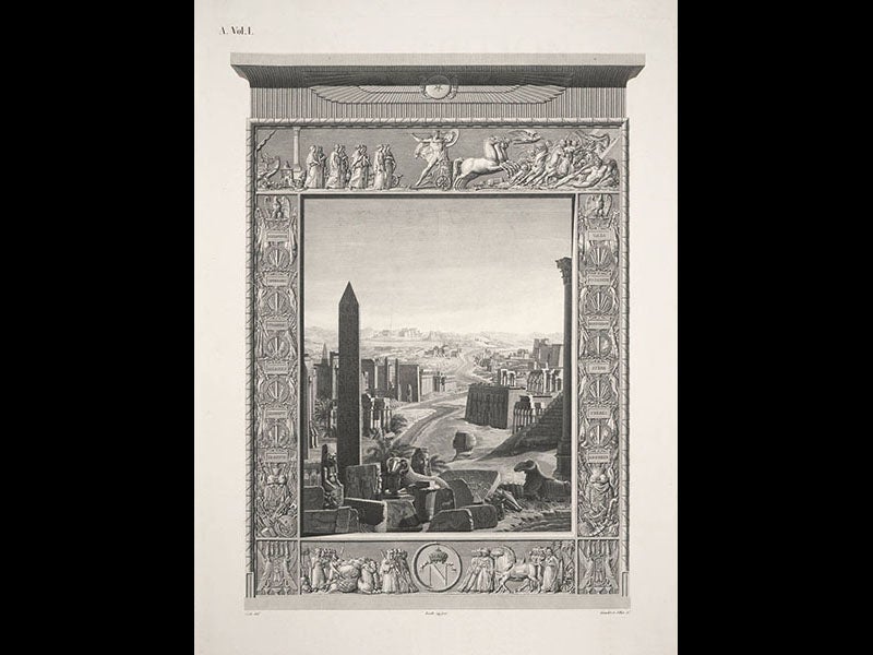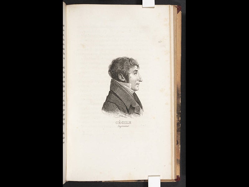 All of Cécile’s artwork appeared in the Description de l’Egypte (1809-28), which we exhibited almost in its entirety in our 2007 exhibition, Napoleon and the Scientific Expedition to Egypt. Cécile also designed the frontispiece for volume 1 of this 23-volume set, which manages to condense all the ruins of ancient Egypt, from the Pyramids to Philae, into one Nile landscape (sixth image). And like most of the savants, Cécile managed to have his likeness sketched by the expedition portrait artist, Andre Dutertre (sixth image); all the portraits were later printed in a separate publication, which gives us a rare and valuable visual record of the participants in Napoleon’s bold scientific adventure.