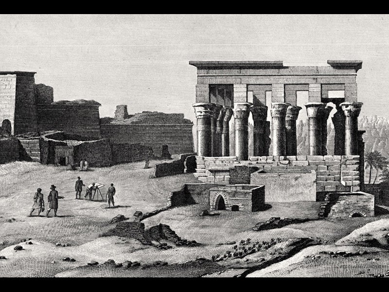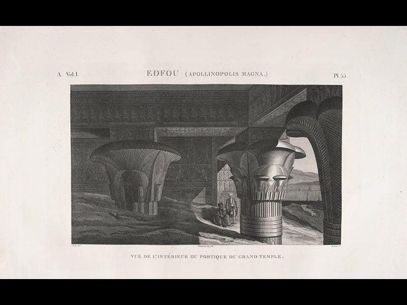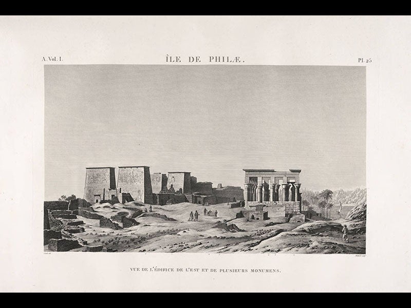 François-Charles Cécile, a French topographic engineer, was born Oct. 19, 1766. In 1798, Cécile was one of 151 engineers, artists, and naturalists, selected to join Napoleon on his invasion of Egypt. These savants gathered in Cairo, organized a society, the Institute of Egypt, and then spread out across the country, mapping the landscape, looking for lost canals, and accidentally discovering the multitudinous ruins of ancient Egypt. Cécile was intensely interested in the antiquities, and he drew most of them, including Luxor (see first image above), Karnak, Edfu (second image), Denderah, and Philae (third image). Like many of the artist-engineers, he liked to put his fellow engineers into the landscape—artists at work—as we see in the detail of a temple at Philae (fourth image).